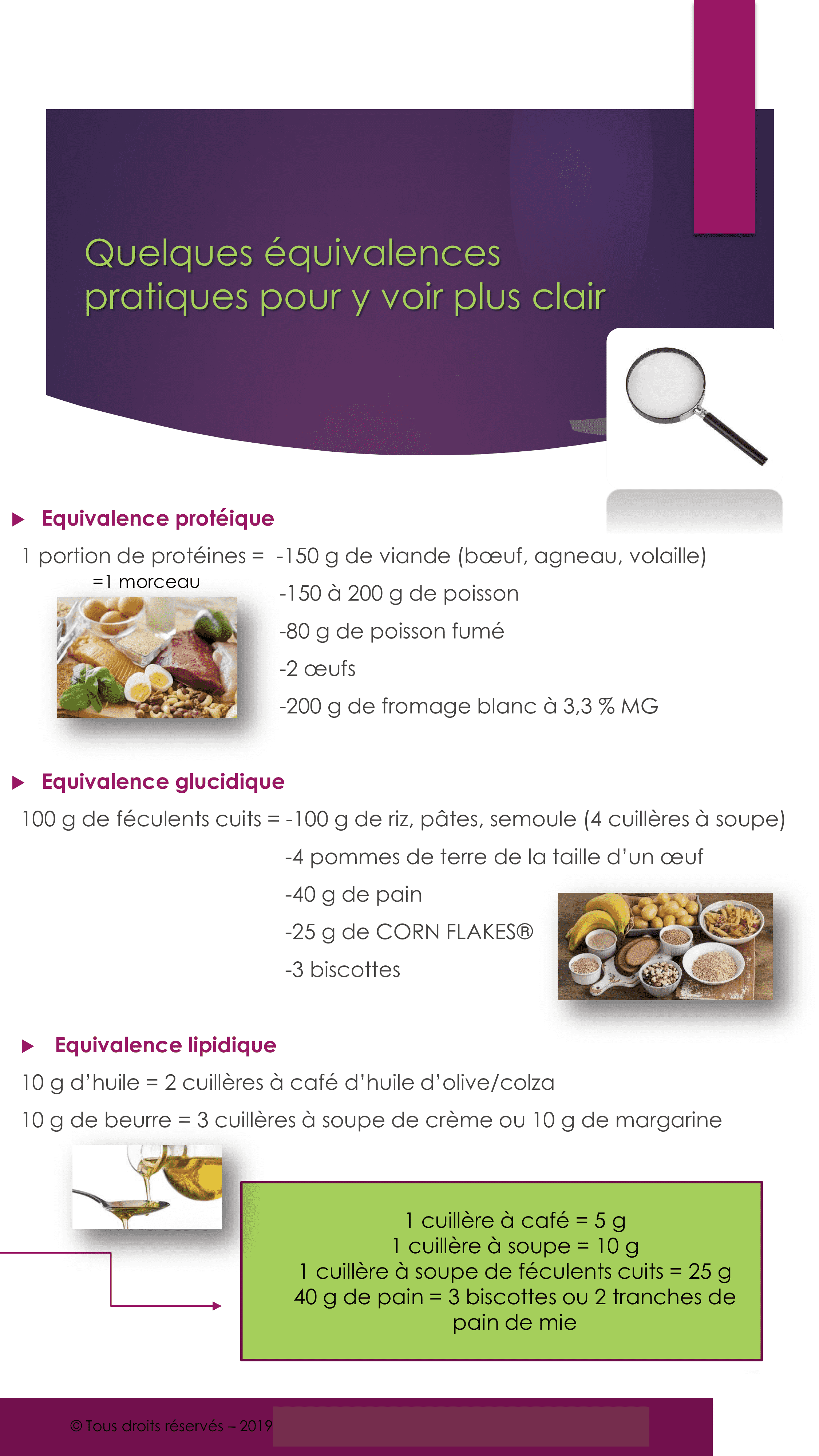 - Des équivalences, des conseils diététiques et des recettes pour améliorer votre quotidien
